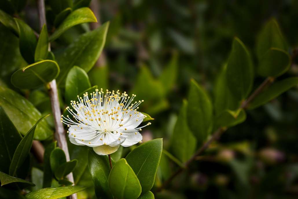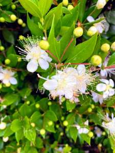 Après la jolie floraison aux senteurs enivrantes, la plante laisse apparaître des petits fruits de moins de 10g, de couleur rouge, qui se développent de septembre à novembre. Ces myrtes, c’est leur nom, sont comestibles et présentent une saveur fruitée qui rappelle celle des fraises des bois. A la croque, c’est un régal parfumé, mais il est possible aussi de transformer ces fruits en confiture ou encore en liqueur, mais en tarte, ils régaleront les gourmands.